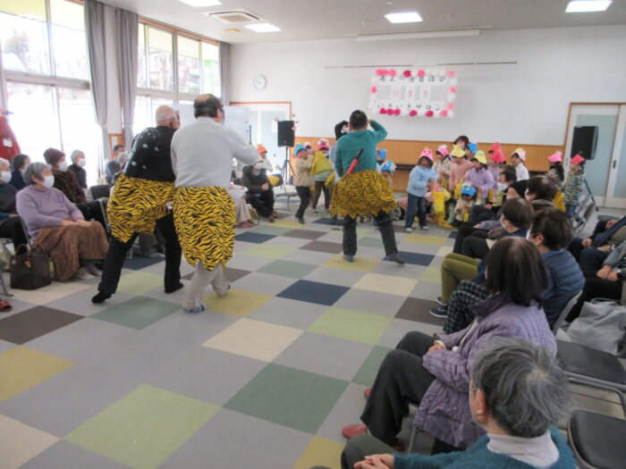いきいきサロンの「豆まき」が1月30日金曜日に行われました。こども園の園児さん28名・参加者・スタッフとで総勢100名近くが楽しい笑い声のあふれるひと時を過ごしました。